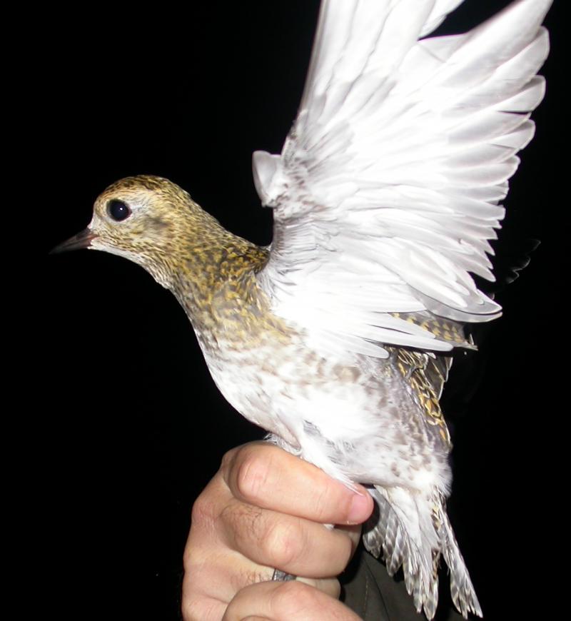 En vuelo no tiene las axilas negras (cosa que si sucede en el otro chorlito habitual en Mallorca, el chorlito gris (Pluvialis squatarola)) y el chorlito dorado no presenta el obispillo blanco. Con esto podemos estar seguros de a quién estamos observando.